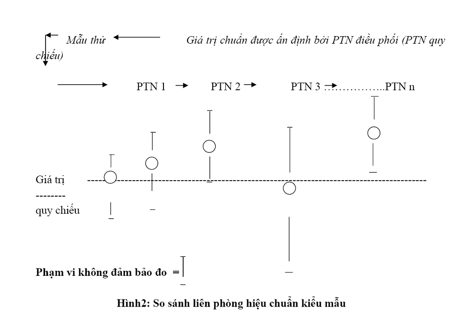 Hình 2: PTN 3 có phạm vi không đảm bảo lớn hơn PTN 1, điều đó có nghĩa rằng PTN 1 có khả năng hiệu chuẩn các thiết bị chính xác cao hơn.Trường hợp này, các PTN thực hiện công việc theo những mức độ chính xác khác nhau, có hiệu lực với điều kiện mỗi PTN làm việc trong khả năng và độ chính xác (độ không đảm bảo của phép đo) được công nhận của họ là phù hợp với thiết bị đang được hiệu chuẩn.