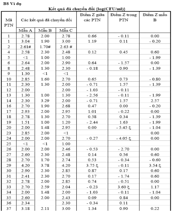 Ví dụ dữ liệu được chọn cho các tài liệu đó (xem trang 27) là một tập hợp của 3 mẫu - tức là một cặp mẫu và một mẫu đơn. Các kết quả từ chương trình thử nghiệm thành thạo khu vực, như vậy việc tính toán vi sinh được chuyển đổi log 10 trước khi phân tích. Trong tường hợp mẫu A&C là đồng nhất, như vậy đó là 3 điểm Z- một giữa các PTN, một trong PTN cho mẫu A&C, và một điểm Z cho mẫu B.