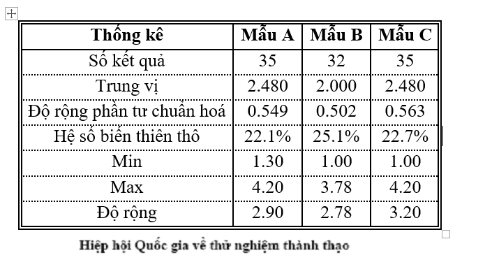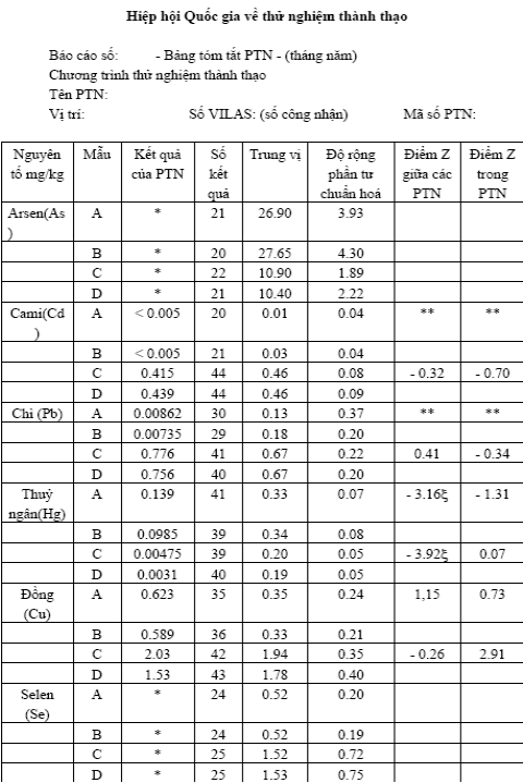 Một tóm tắt kết quả tiêu biểu/mẫu xuất hiện trong trang 30. Tại đỉnh của mỗi trang là tiêu đề của chương trình và đặc điểm của PTN. Phần chính của bảng tóm tắt gồm 8 cột. Đặc tính của mẫu, phép thử, kết quả của PTN, số kết quả, trung vị và độ rộng phần tư chuẩn hoá cho mẫu/ phép thử đó, 2 điểm Z cho cặp mẫu.